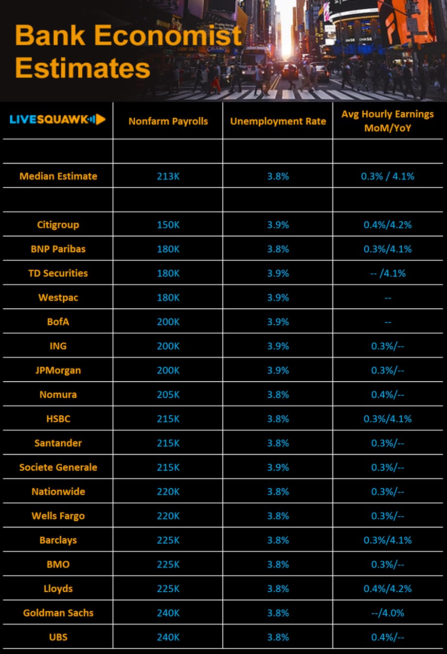 BofA Global Research- - We expect nonfarm payrolls to increase by 200k. One of the reasons we are calling for a slowdown in job growth is that payrolls in the month of March have shown a tendency to be weak relative to February in recent years. Average hourly earnings, meanwhile, are likely to rise by 0.3% m/m or 4.1% y/y. On the household survey side, we expect the unemployment rate to remain at 3.9%.